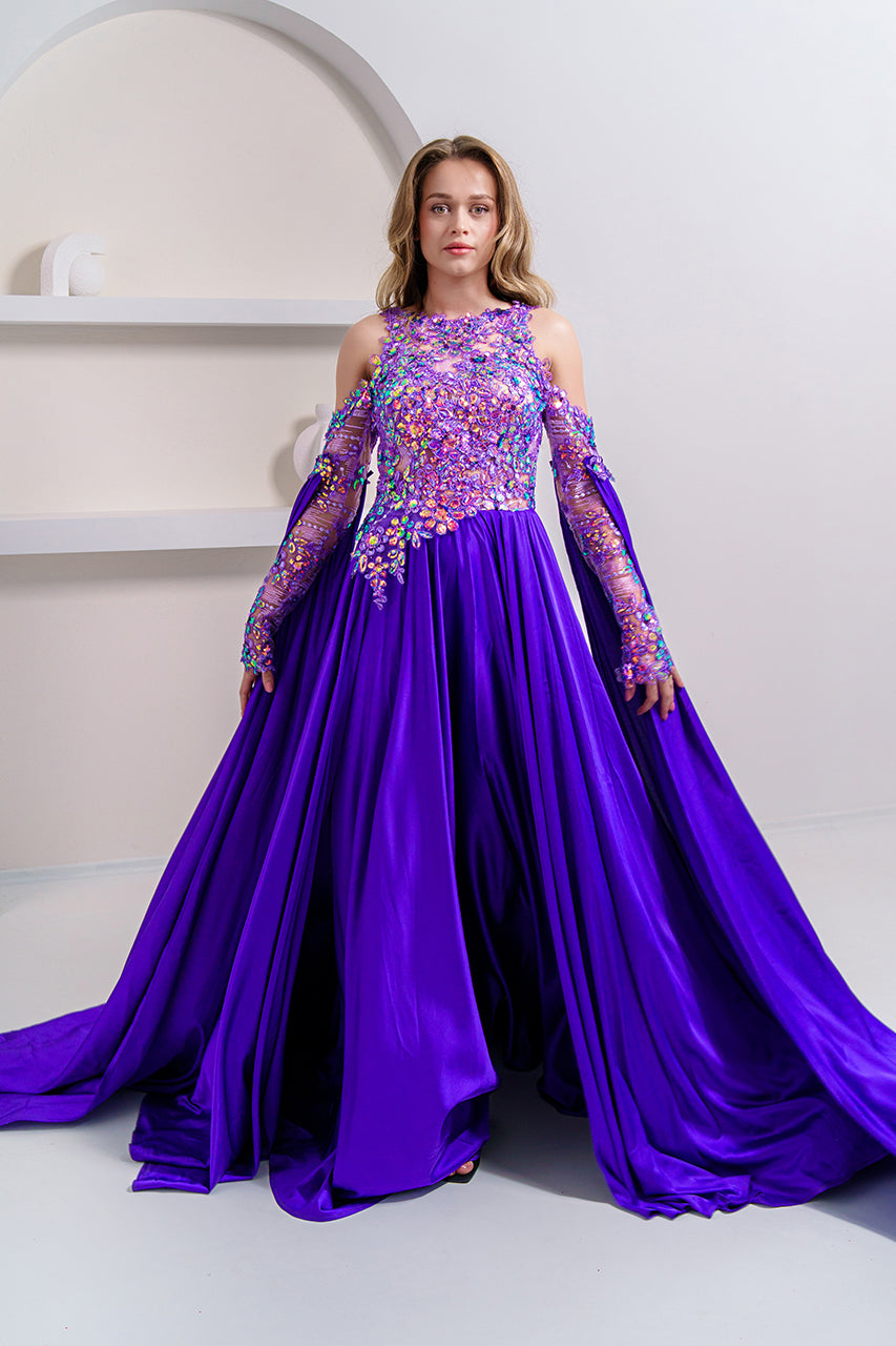 Embroidered Sheer Corset Evening Dress with High Slit and Satin Skirt