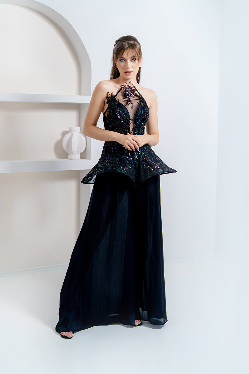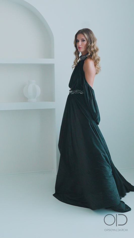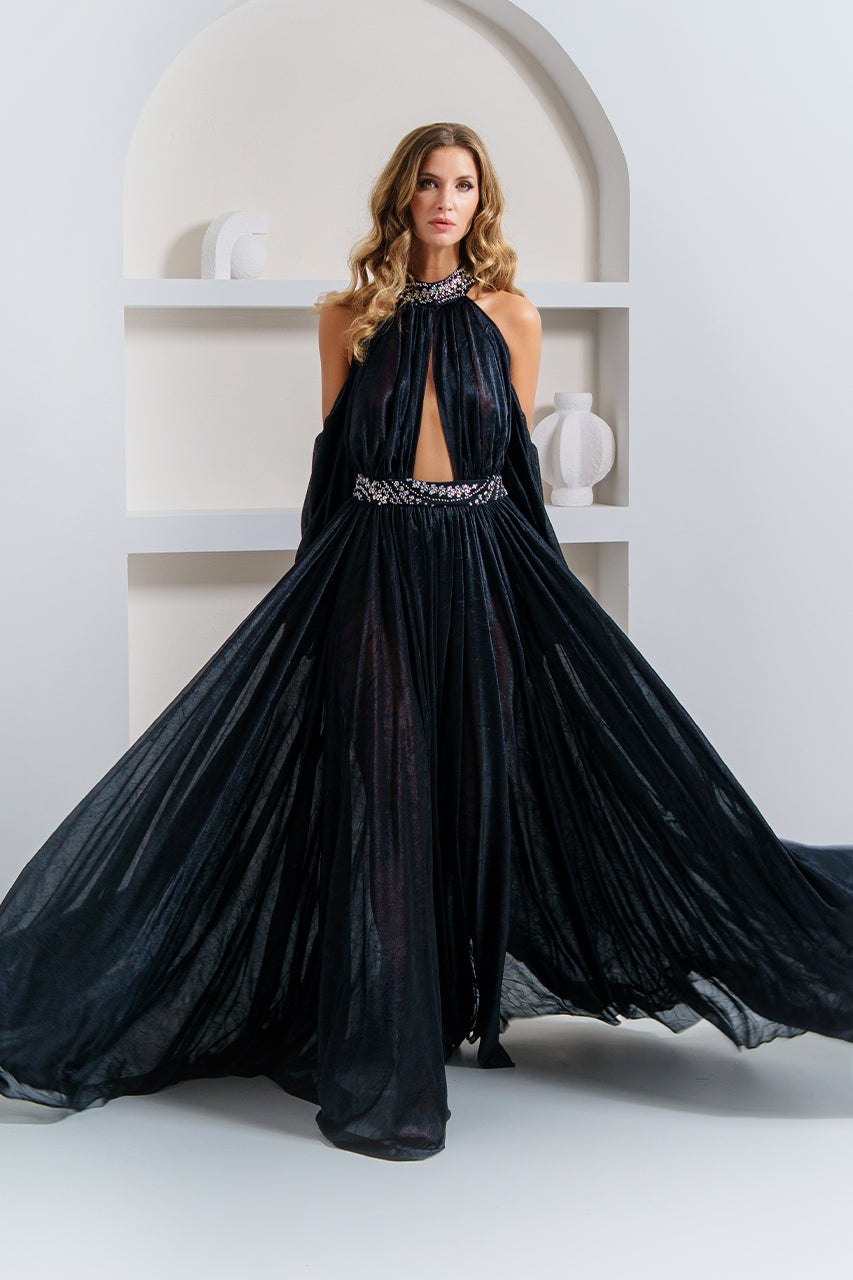Black Open Back Evening Gown with Beaded Neckline and Waist Embellishment