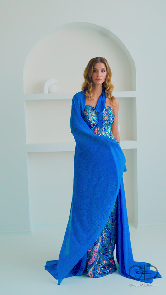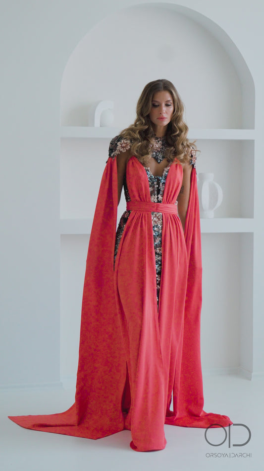 Red Sequin High Slit Evening Dress with Sheer Tulle Cape
