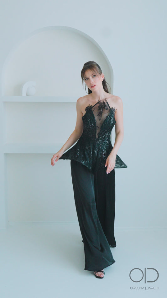 Green Draped Sequin Evening Dress with Plunging Neckline and Built-In Shorts