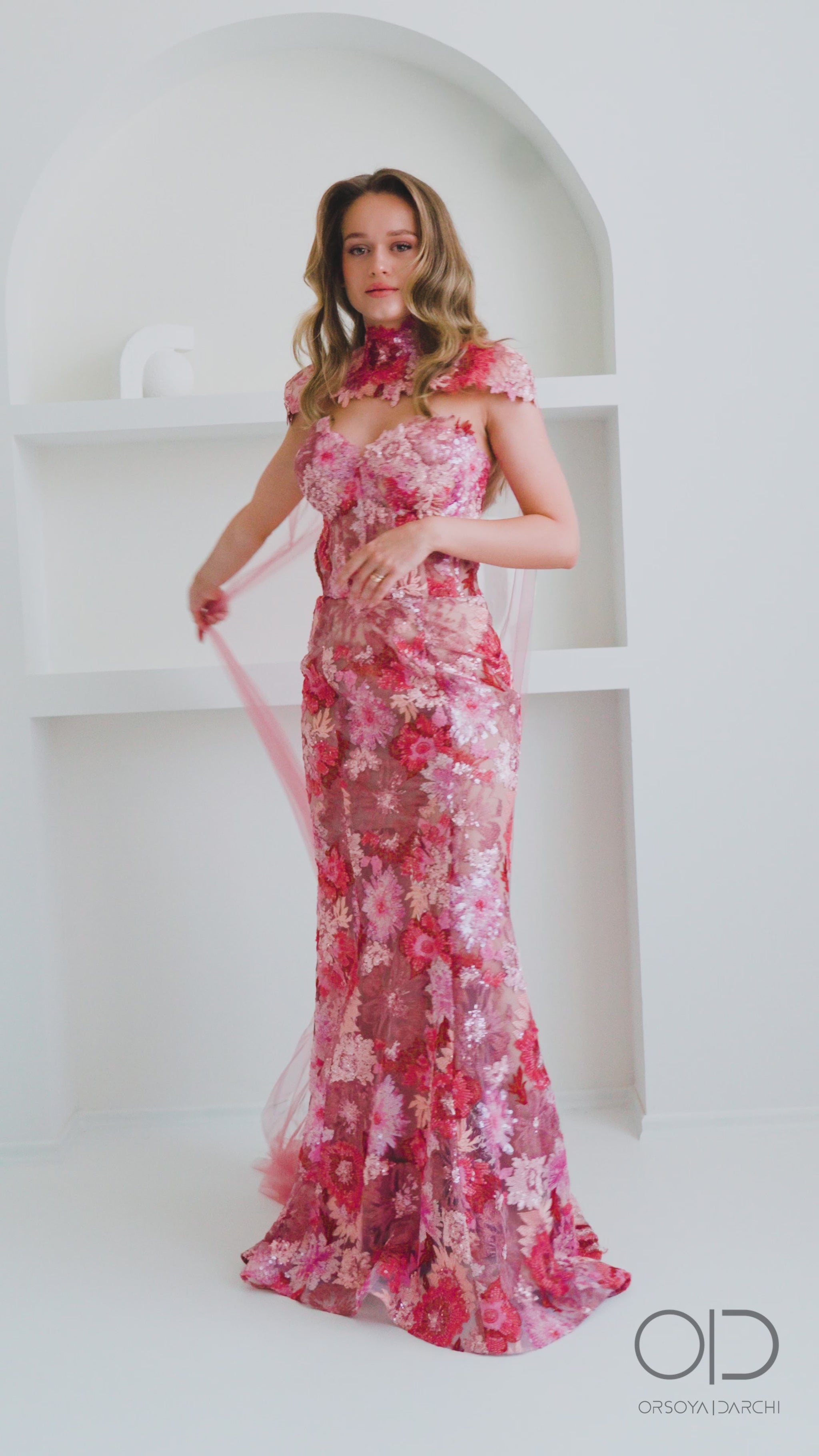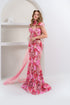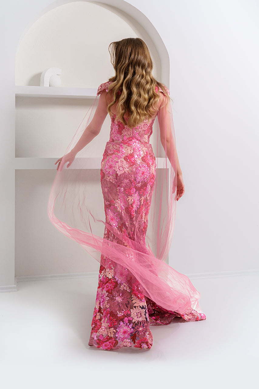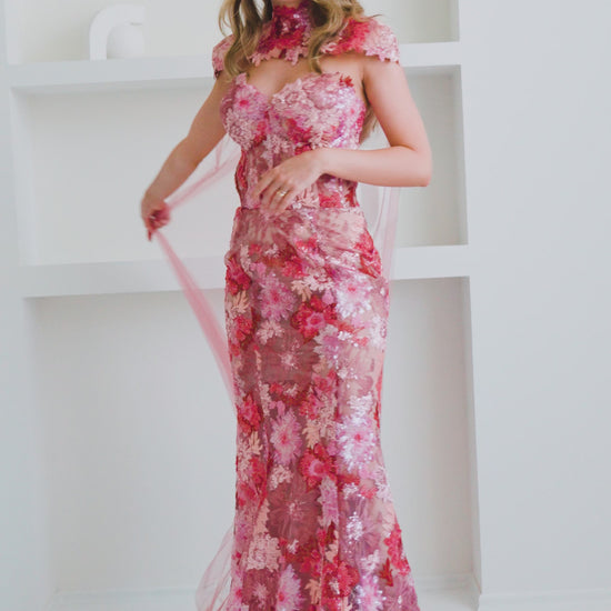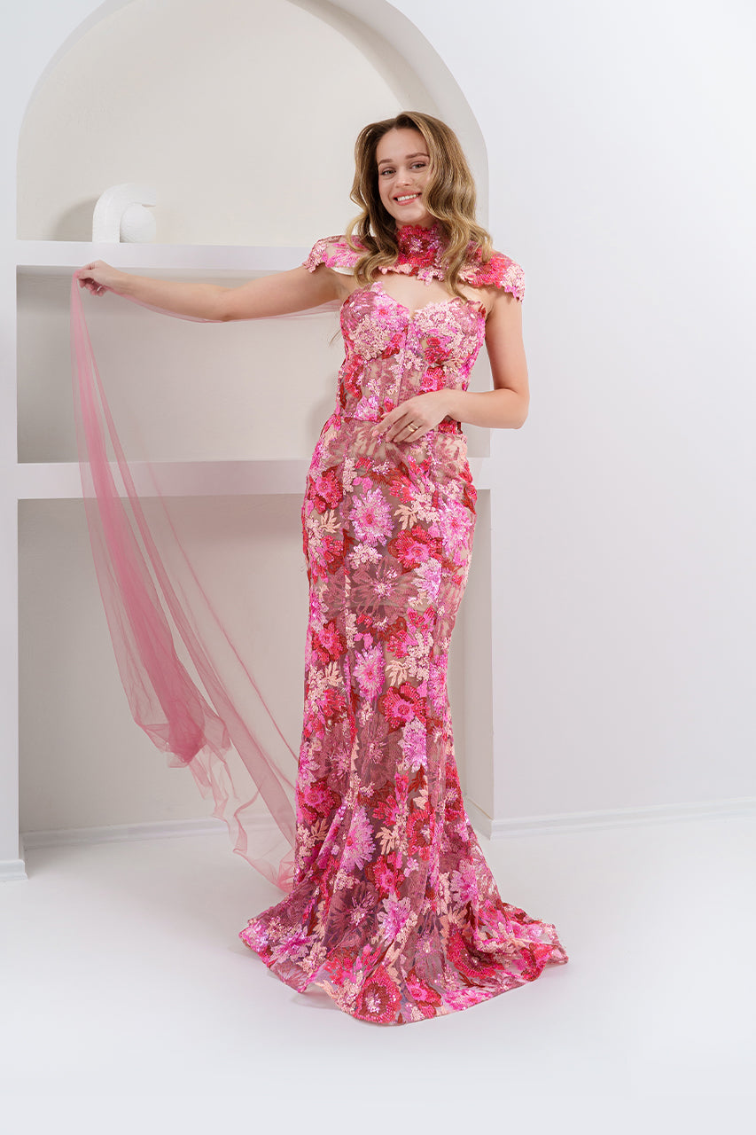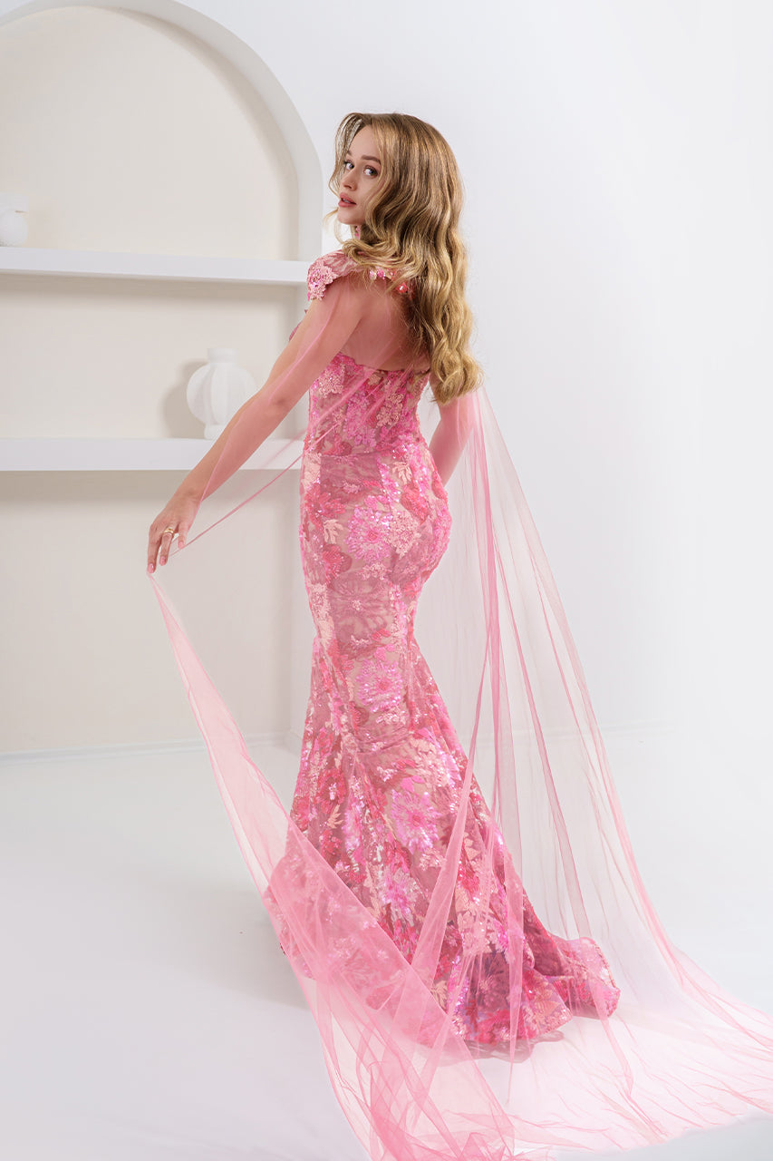 Powder pink sequin corset evening gown with detachable tulle train