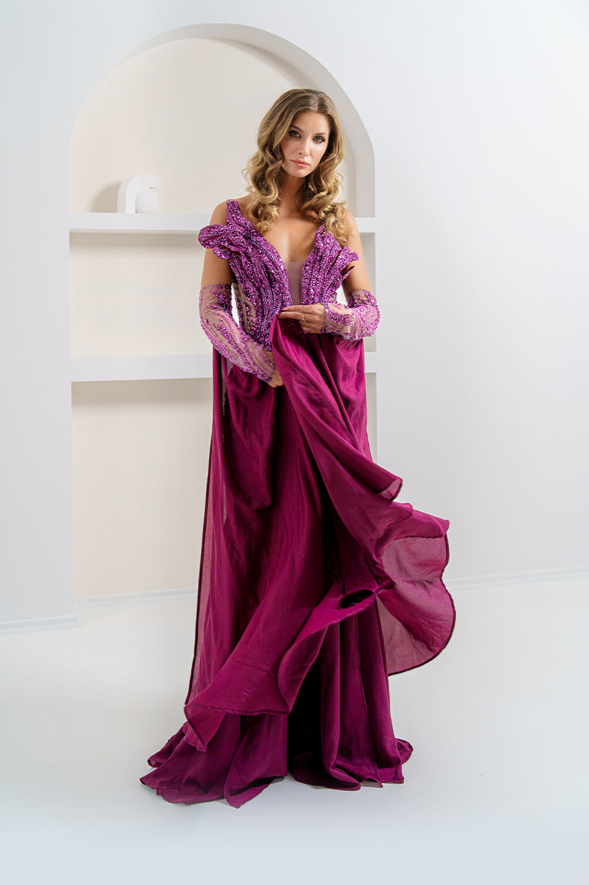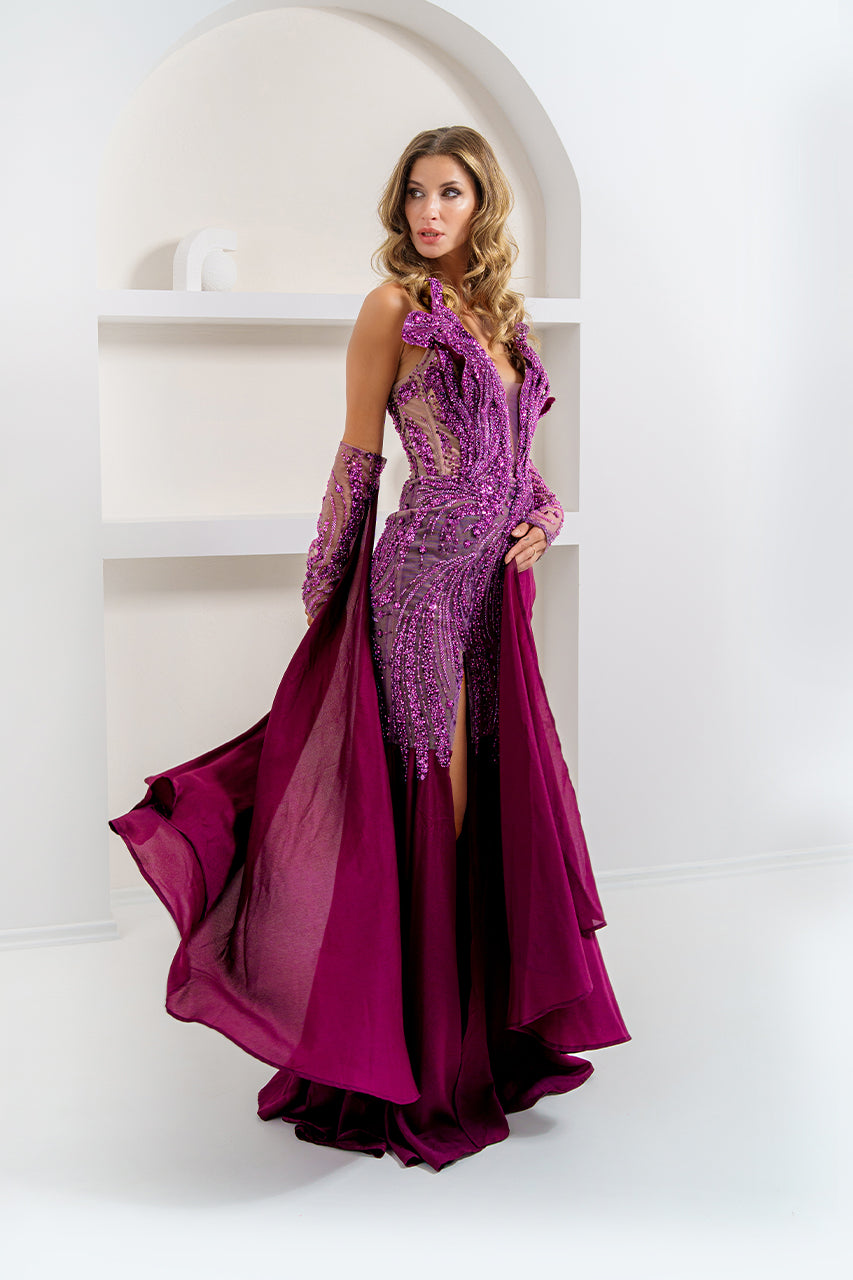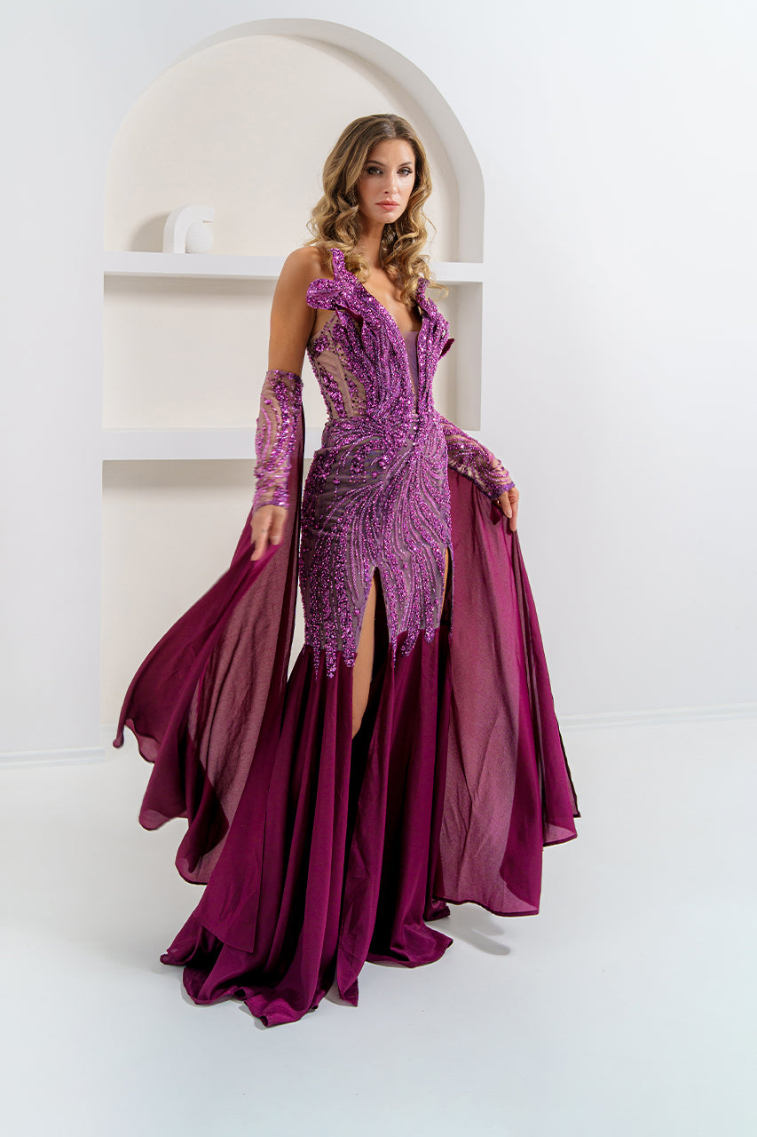 Ez a ragyogó, mélyzöld flitteres estélyi ruha lenyűgöző választás bármilyen különleges alkalomra. A magasított, hosszú vállrész eleganciát sugároz, míg a hasíték modern és merész megjelenést kölcsönöz. Ez az egyedi Orsoya Darchi ruha biztosan minden tekintetet magával ragad.