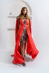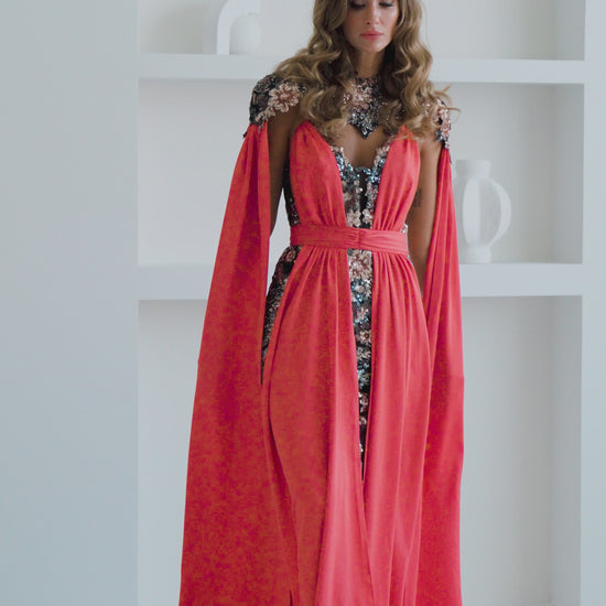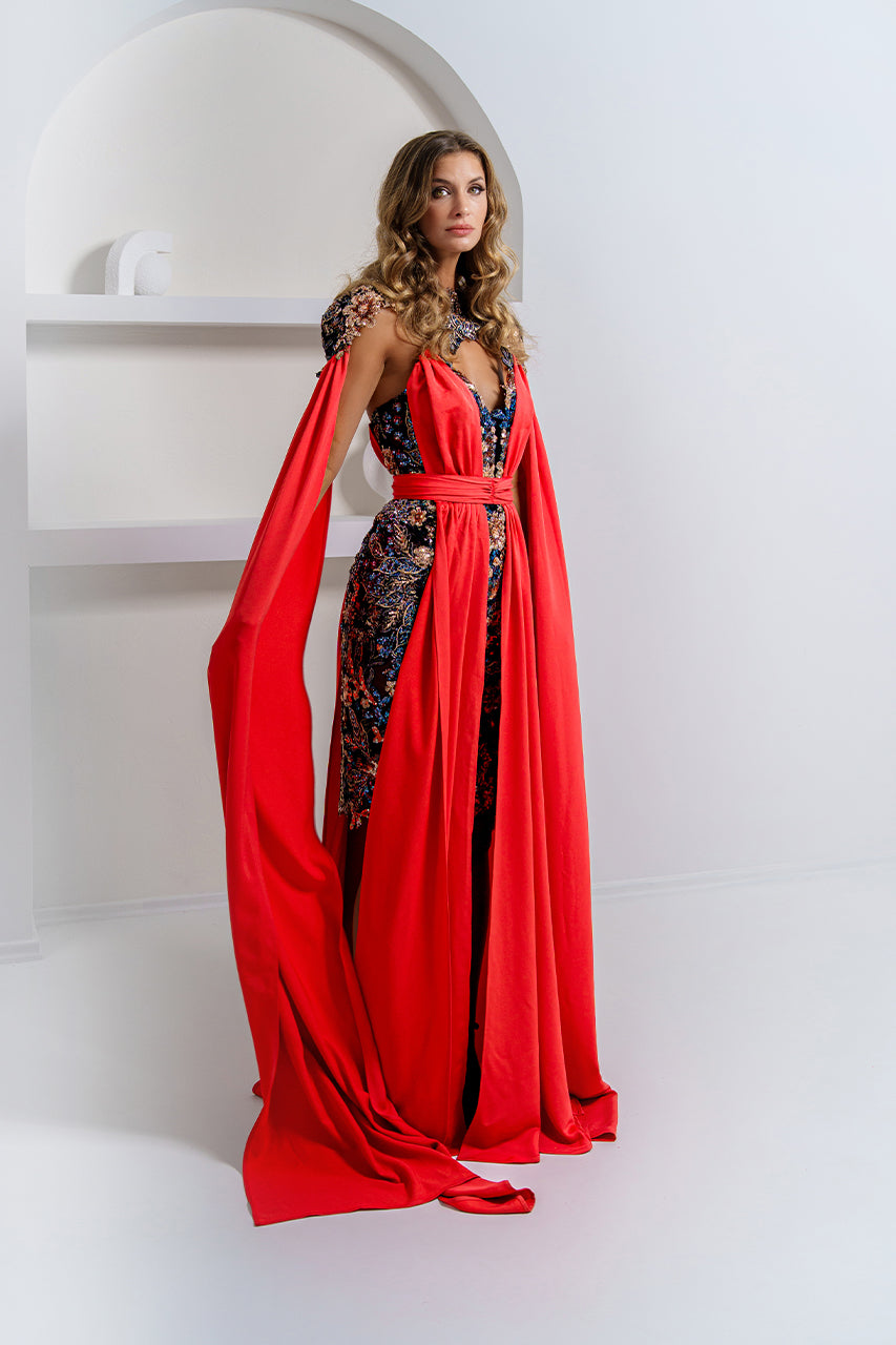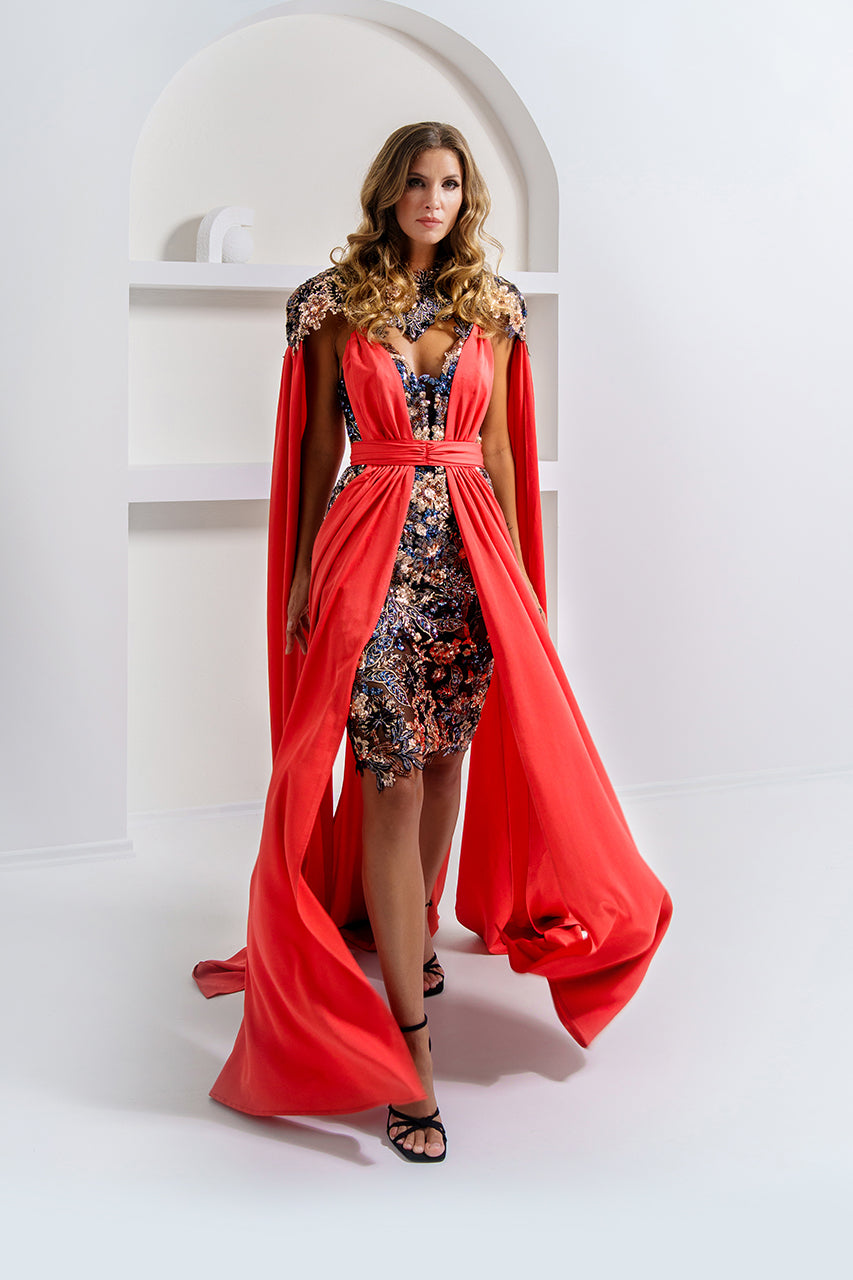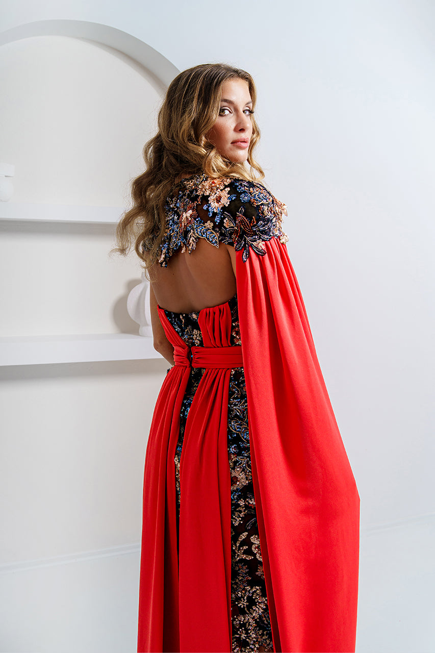 Orange Satin Overlay Evening Gown with Black Sequin Embellished Base