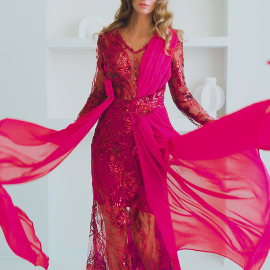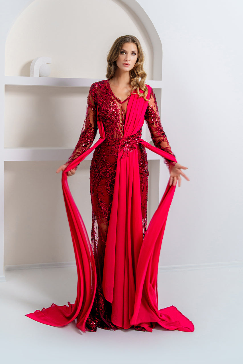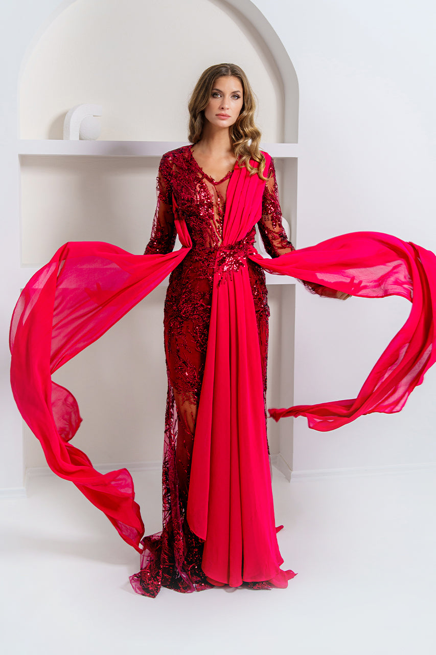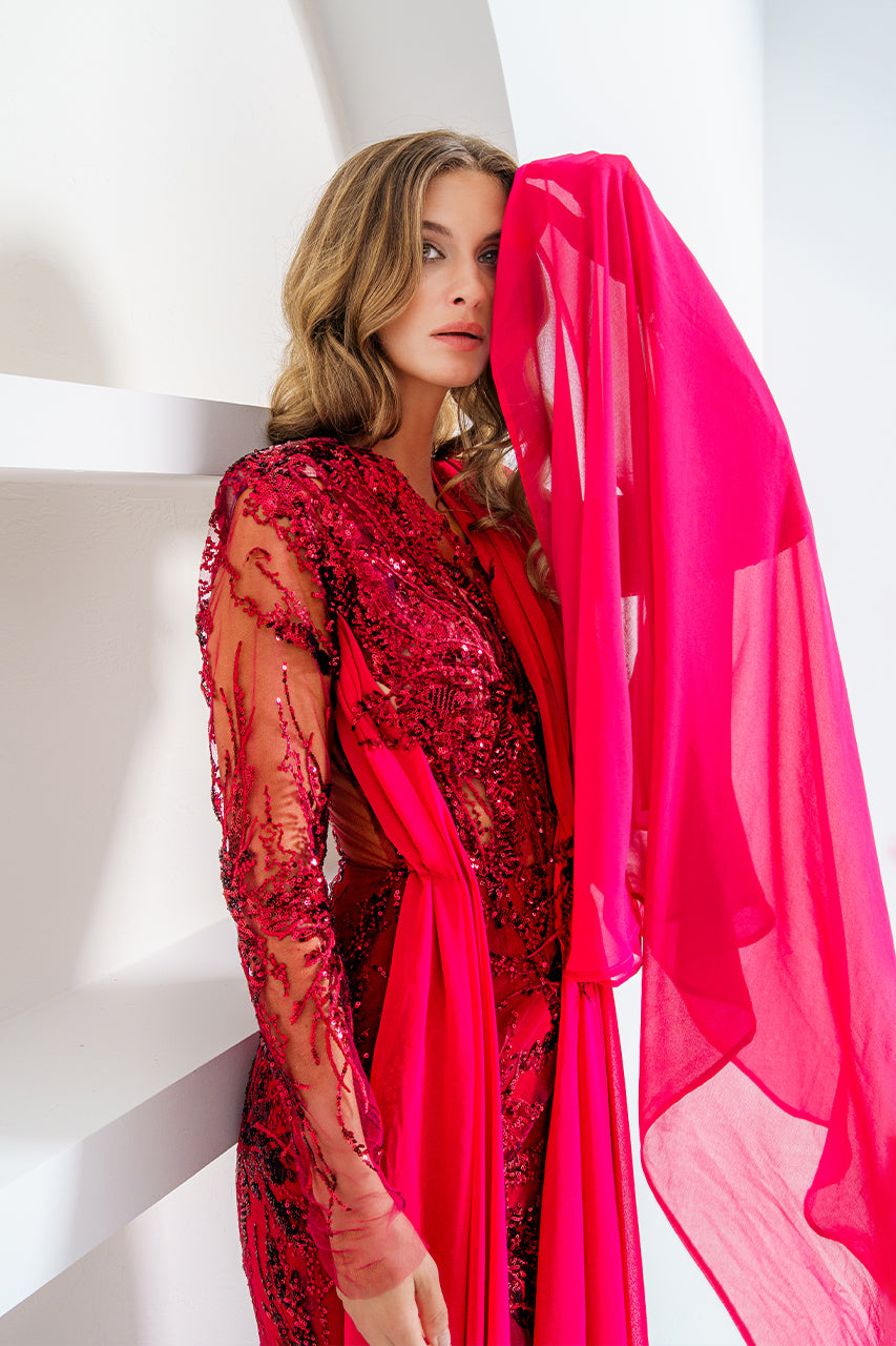 このユニークで輝く深緑のスパンコール付きイブニングドレスは、特別な機会にぴったりの選択です。強く長いショルダーディテールがエレガンスを醸し出し、スリットがモダンで大胆な印象を与えます。前後が閉じたデザインはクラシックなスタイルを確保します。このユニークなOrsoya Darchiドレスは、すべての視線を引きつけること間違いなしです。