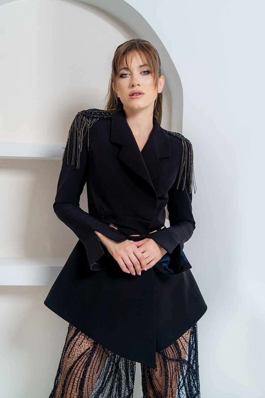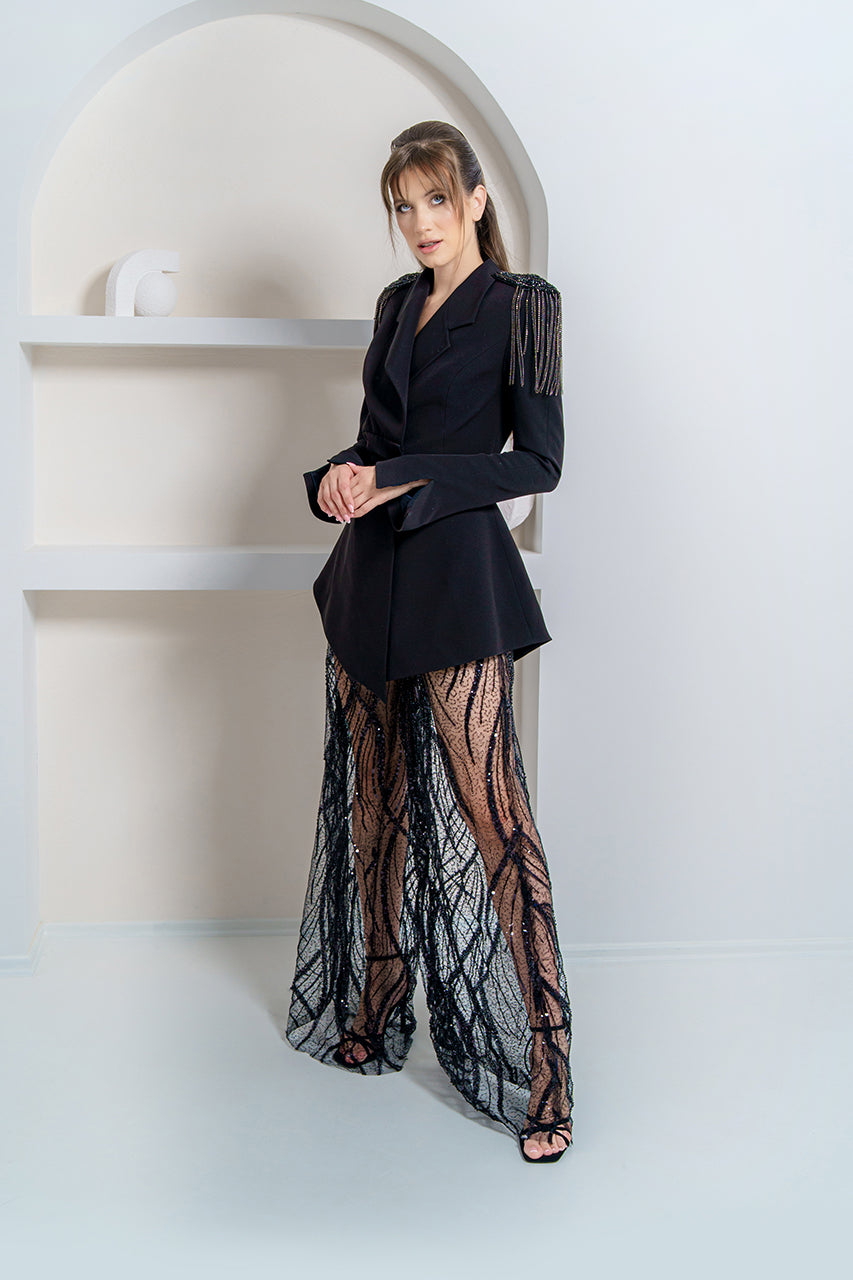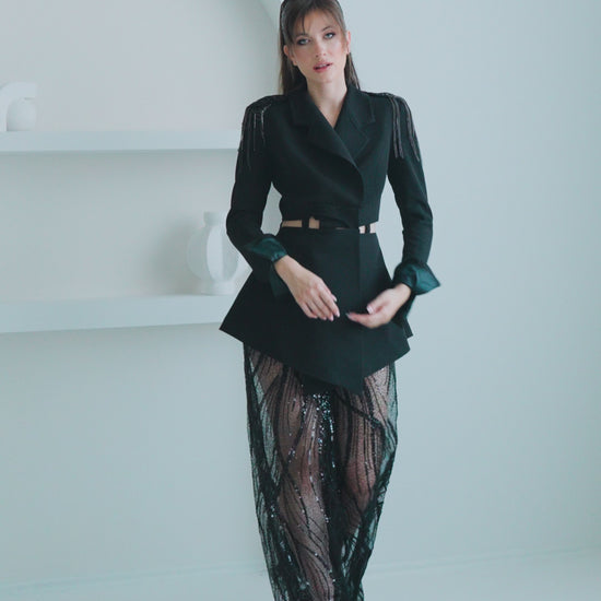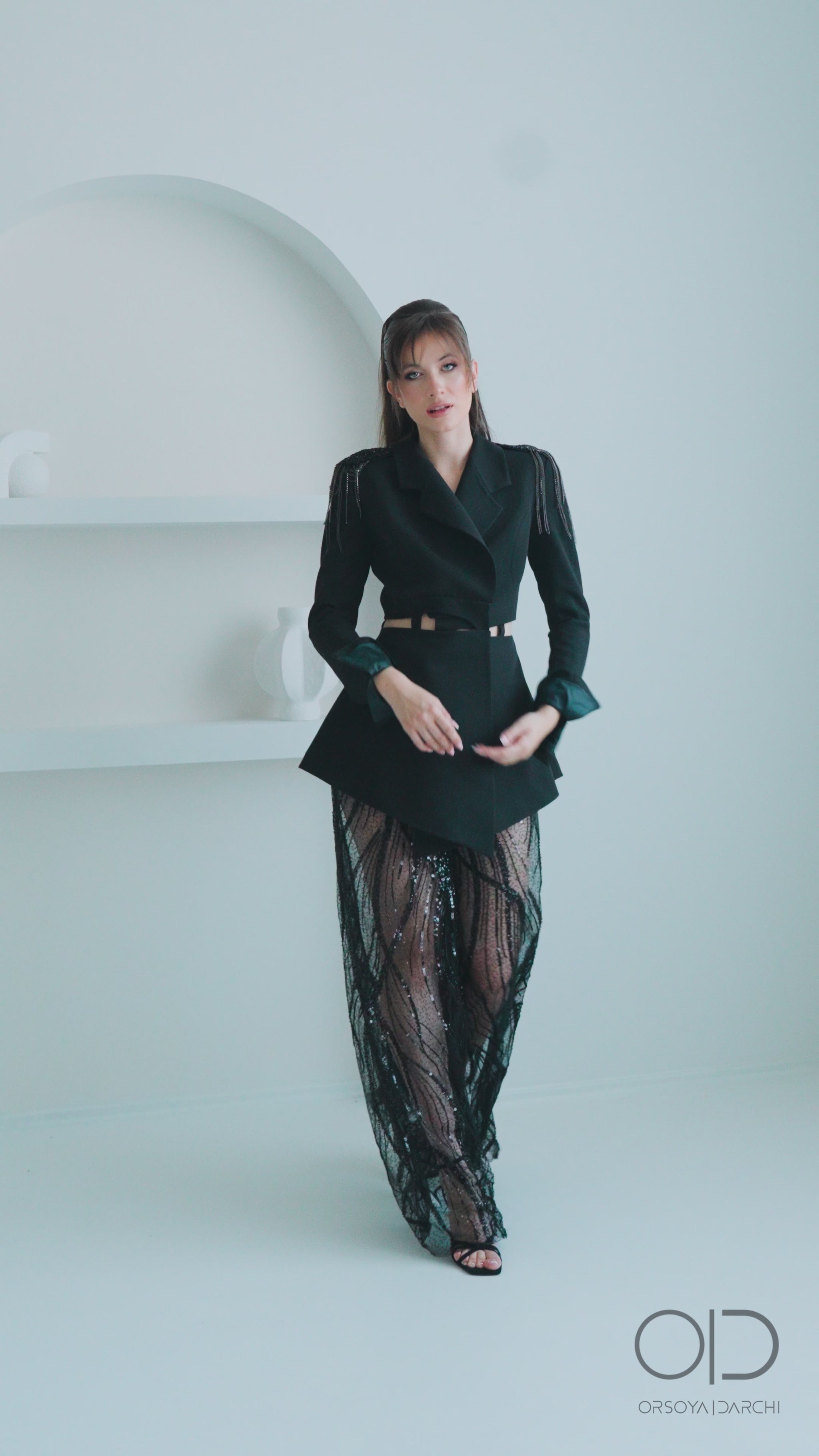 このユニークで輝く深緑のスパンコール付きイブニングドレスは、特別な機会にぴったりの選択です。強く長いショルダーディテールがエレガンスを醸し出し、スリットがモダンで大胆な印象を与えます。前後が閉じたデザインはクラシックなスタイルを確保します。このユニークなOrsoya Darchiドレスは、すべての視線を引きつけること間違いなしです。
