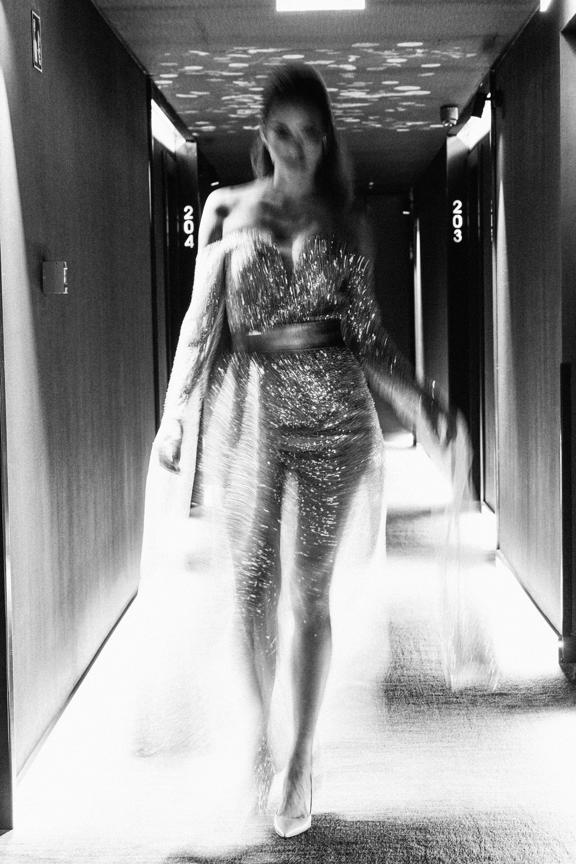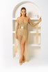 The gown is crafted from a delicate layer of tulle, fully embellished with fine, shimmering beads for an all-over sparkling effect. A nude-toned underlayer provides the perfect balance between transparency and elegant coverage.